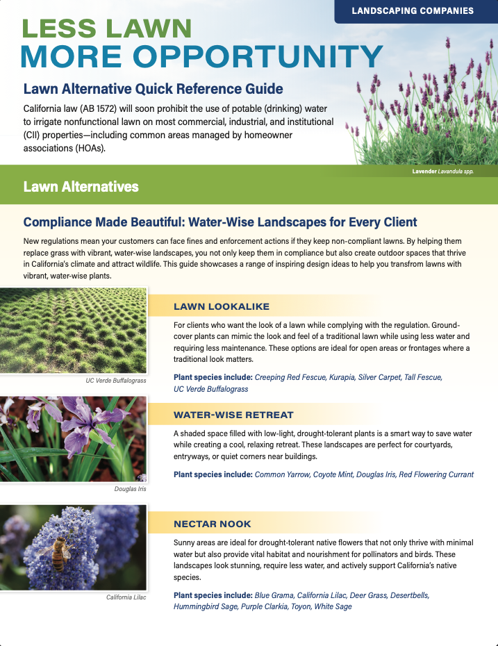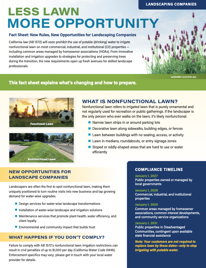 As trusted providers of routine maintenance and landscape advice, contractors play a gatekeeping role in identifying NFT and recommending upgrades. Landscapers are often the first to recognize opportunities for turf conversion and are well-positioned to connect clients with available rebates and technical resources. When trained and engaged, they become a vital link between water agencies and customers—supporting compliance, landscape transformation, and long-term water savings.