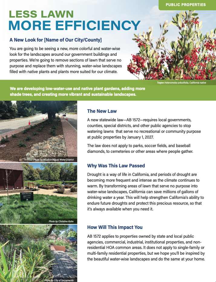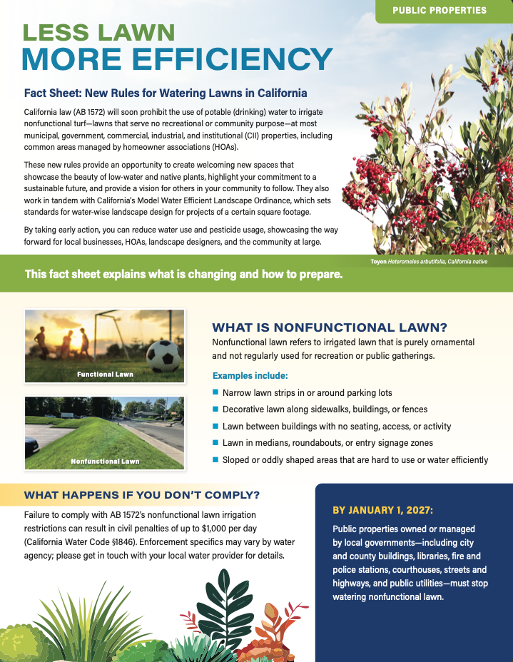 Municipal properties are subject to the earliest compliance deadline under AB 1572, which is January 1, 2027. After that date, potable water may no longer be used to irrigate non-functional turf on public agency properties.